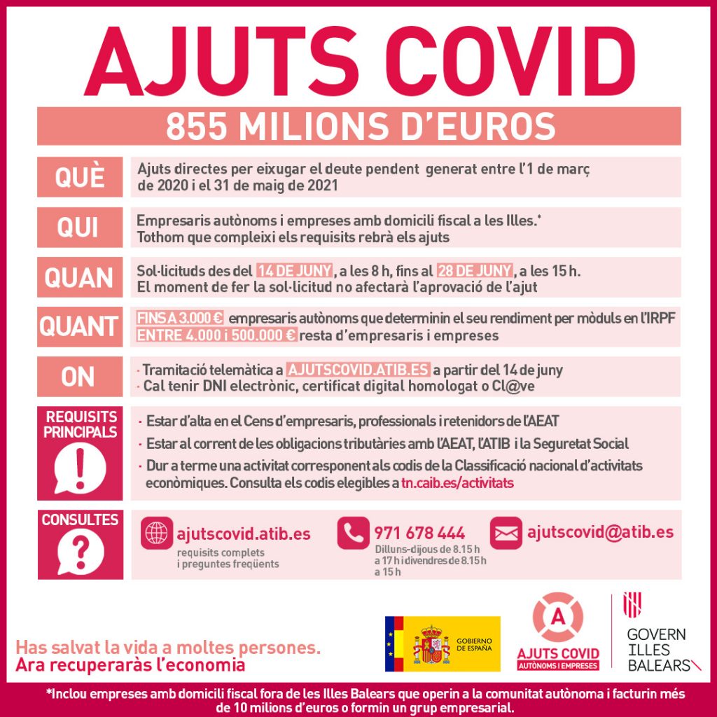 Por otro lado, este jueves 10 de junio a las 13.00 horas, el Dtor. Gral. de Promoció Económica del Govern Balear, Sr. Manuel Porras, ofrecerá un webinar en el que se explicarán estas lineas de ayudas que se podrán solicitar a partir del 14 de junio.